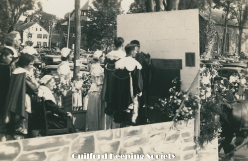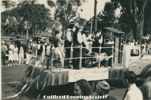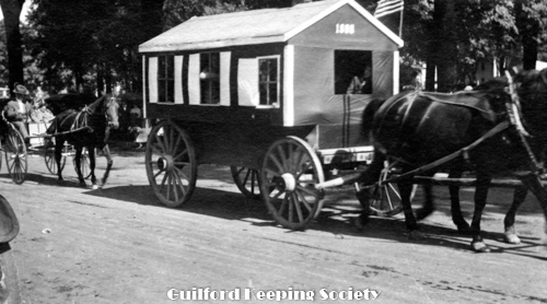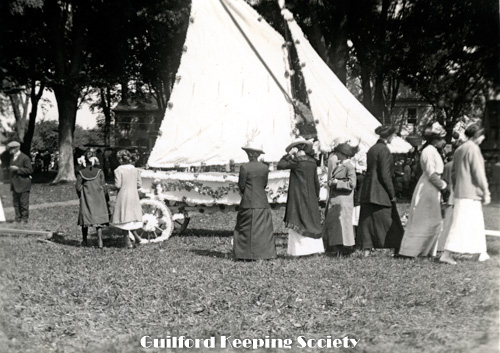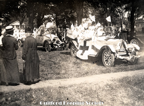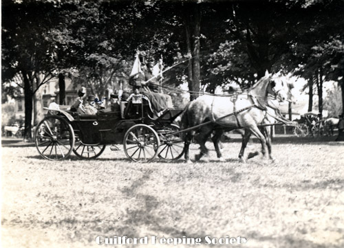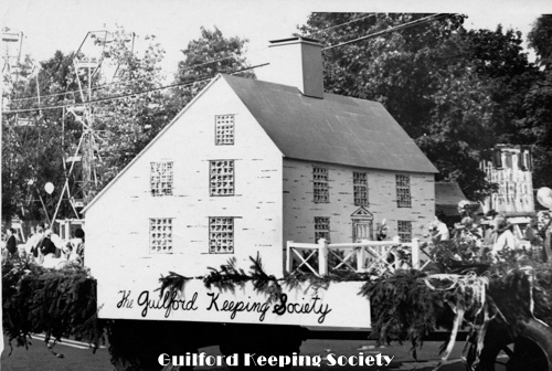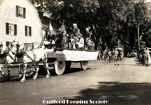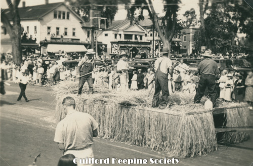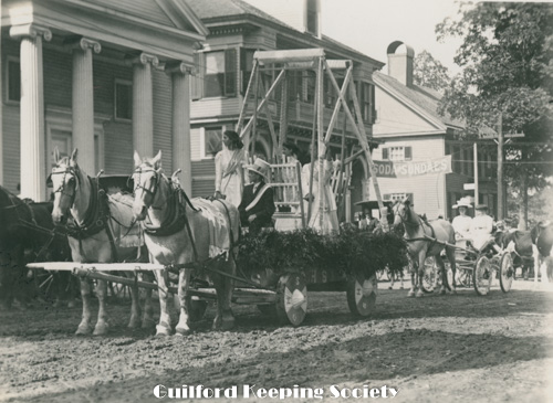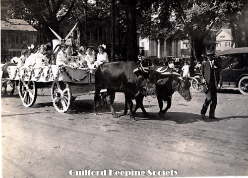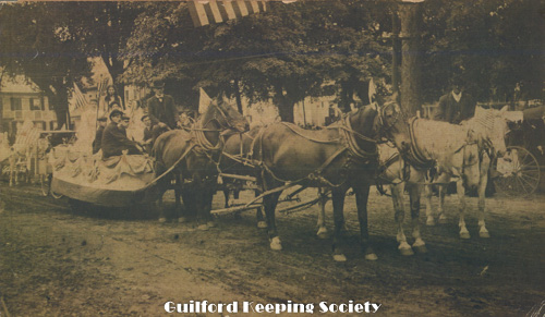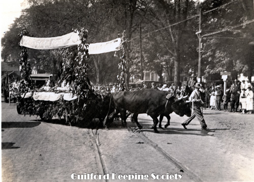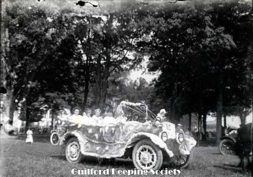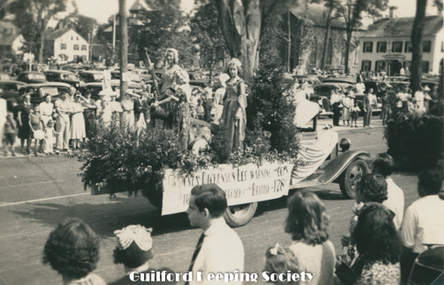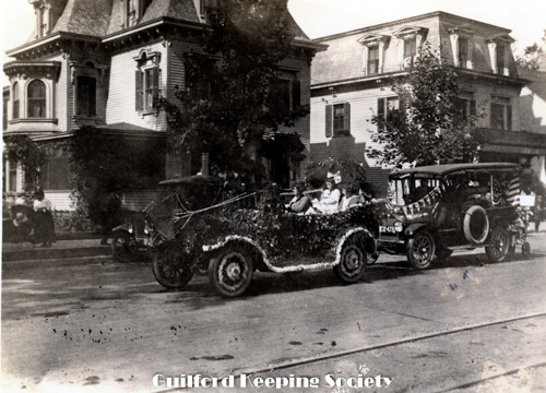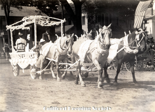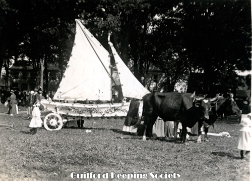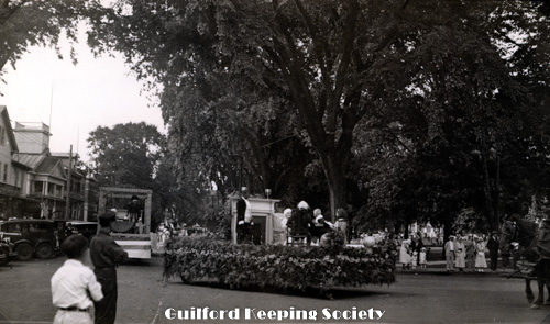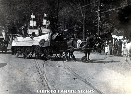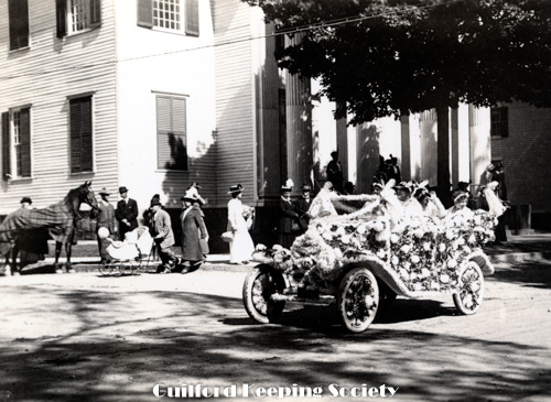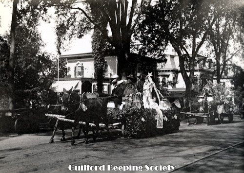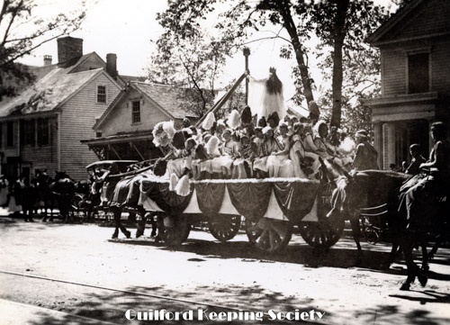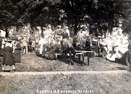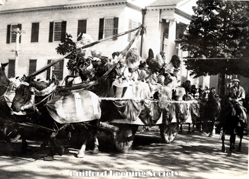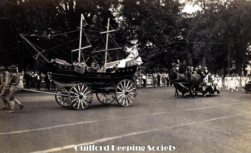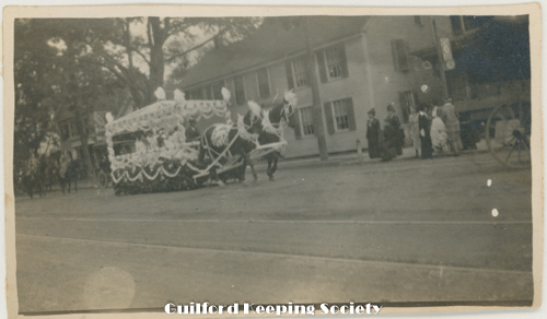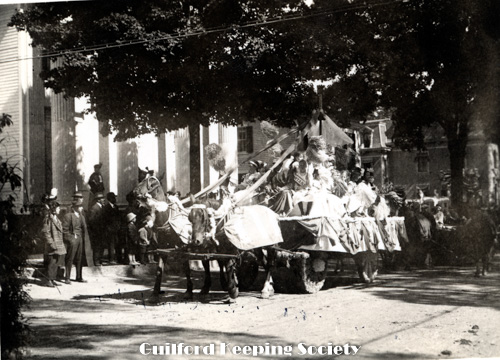 Parade float in the Guilford Fair parade on Broad Street in front of the First Congregational Church facing east