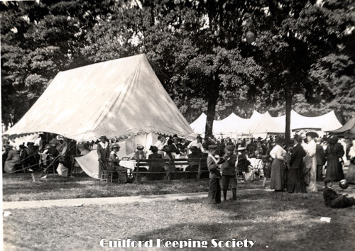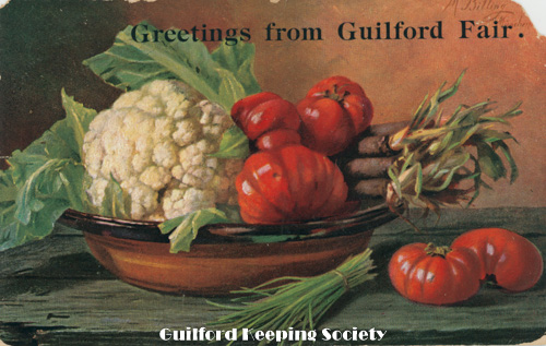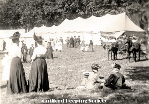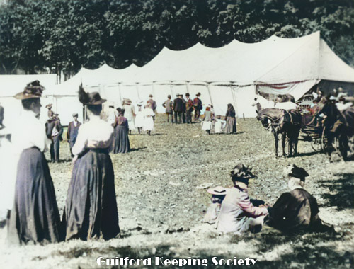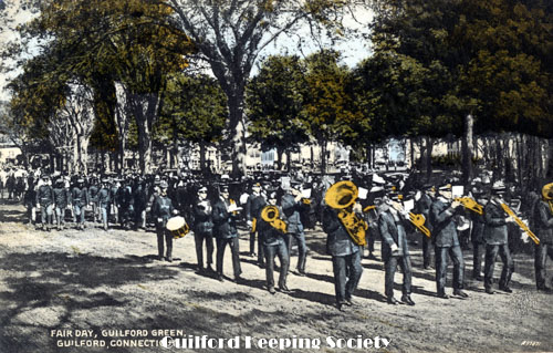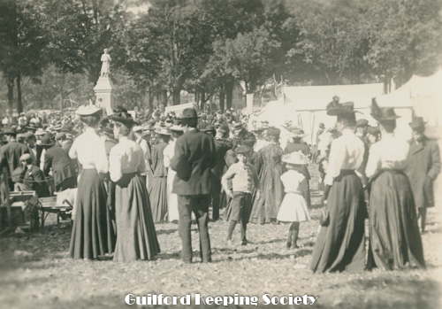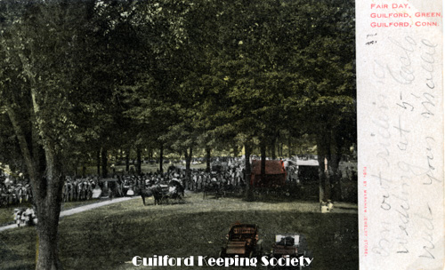 Color tinted postcard pub. by Markham Jewelry Store. Fair Day Guilford Fair on the Green. Postmark 1907