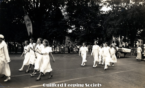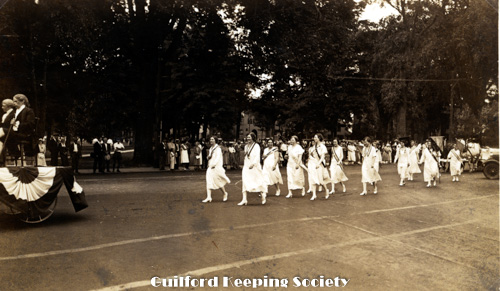 Postcard of Guilford Fair parade on Boston St Town Hall in background. Tall woman in white dress is Marie Griswold c1920