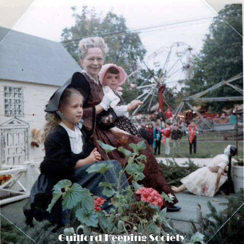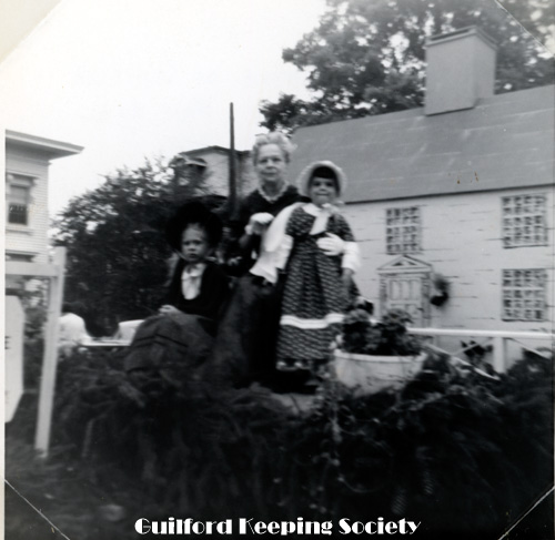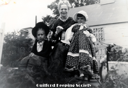 Ethel Dean Coleman on Guilford Keeping Society Guilford Fair float in Guilford Fair parade with 2 girls. She's holding 2nd premium ribbon. From Ethel Colman's scrapbook Sept. 17, 1965