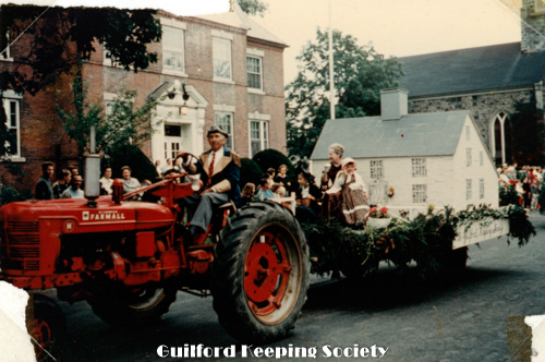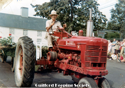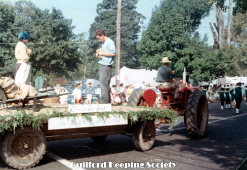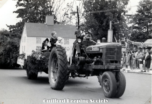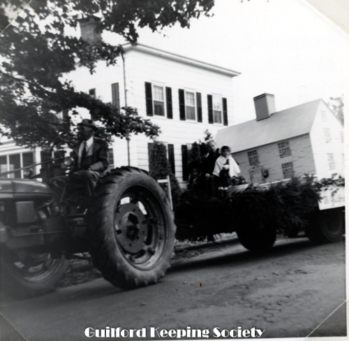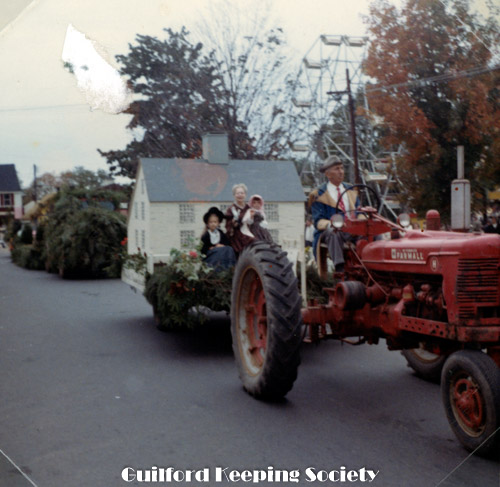 Ethel Dean Coleman (adult on float), Frederic G. Davis on tractor. Keeping Society float Guilford Fair parade, which won 2nd premium award. Sept 17, 1965