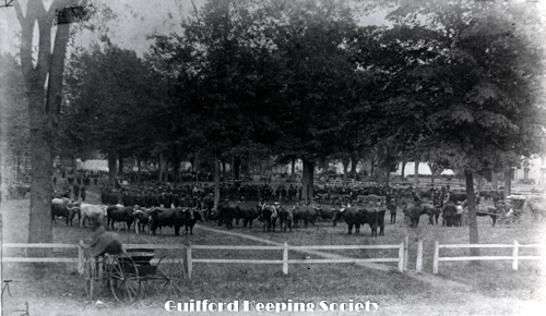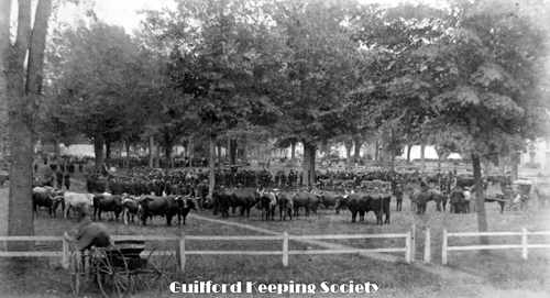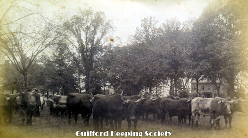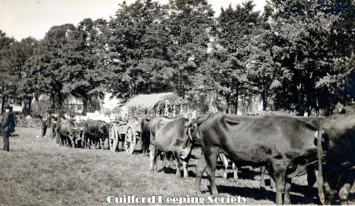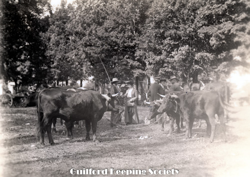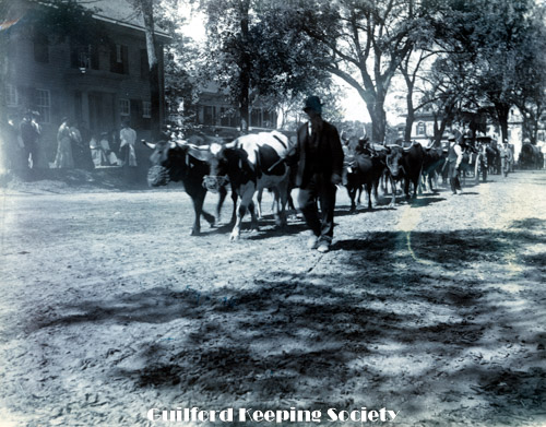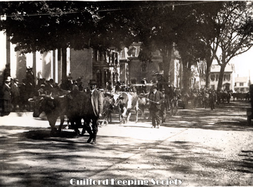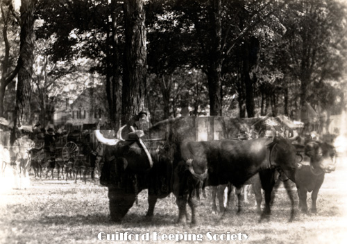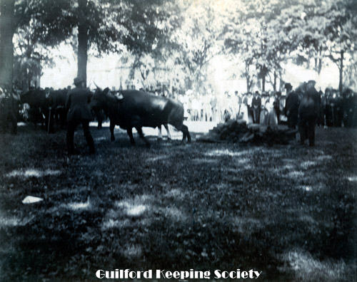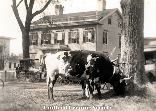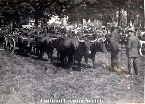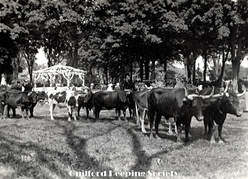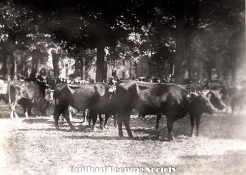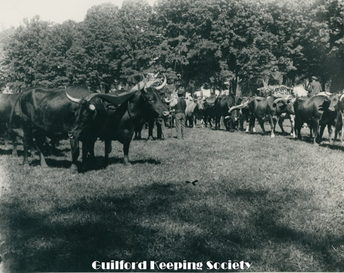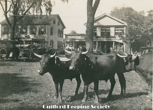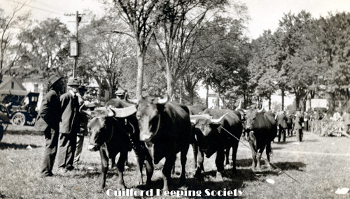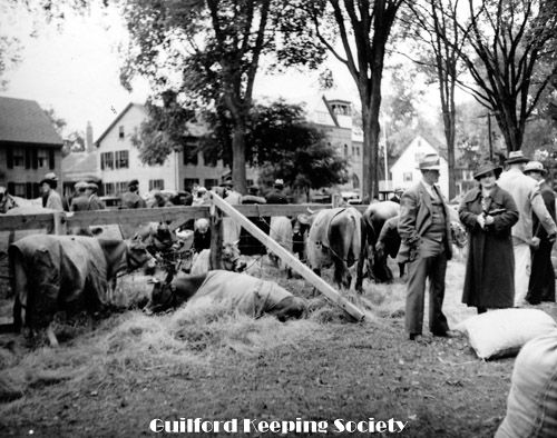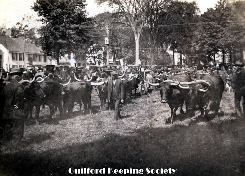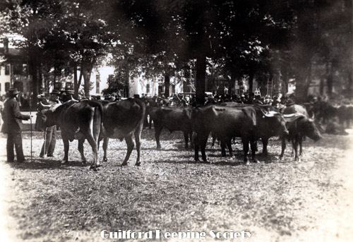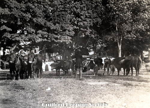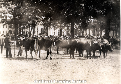Oxen on the Green at the Guilford Fair. Picture was taken looking toward Whitfield Street near the northwest corner of the Green
