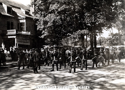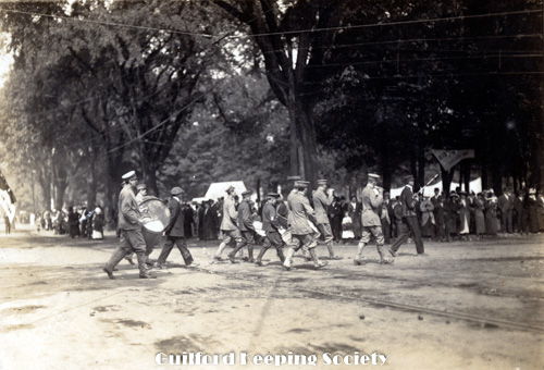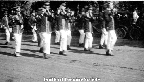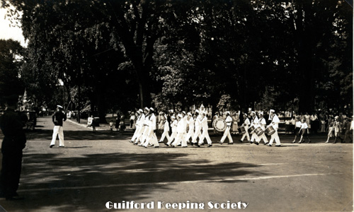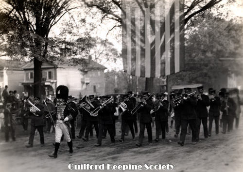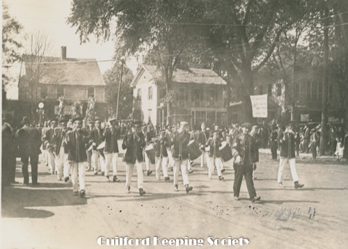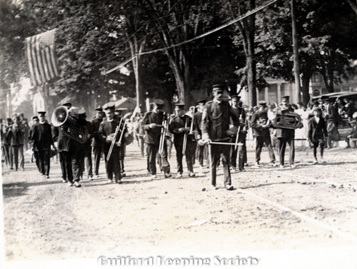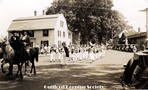 Postcard of a band in the Guilford Fair parade on Whitfield St, Elias Cadwell house 1 Boston St on left c1920