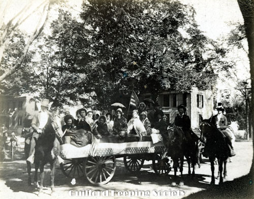 Parade float on the Green. High School float with a representative from each class. Marie Griswold on right with back turned. 1912 (Marie Griswold)