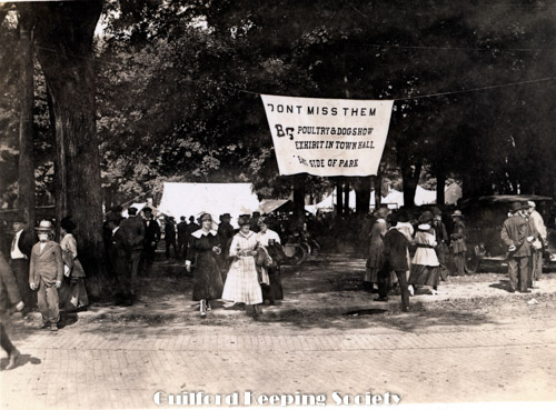 Crowds on the Green. Sign reads Don't miss them big poultry and dog show exhibit in the Town Hall east side of Park