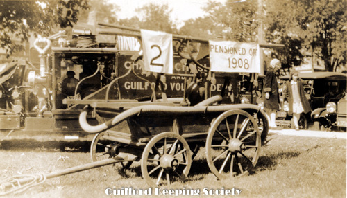 Engel’s Firetruck on the Green. This photo sent by Mrs. Emma E.G. Pillsbury to Myra D. Monroe to be placed where it would be appreciated and preserved, in 1935.