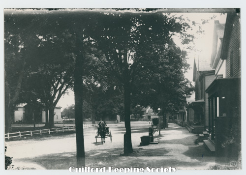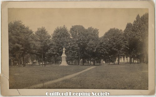 c1895 view of Civil War Statue in the middle of the Guilford Green. Looking north toward Broad St Date c1895