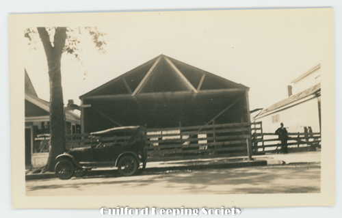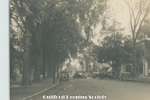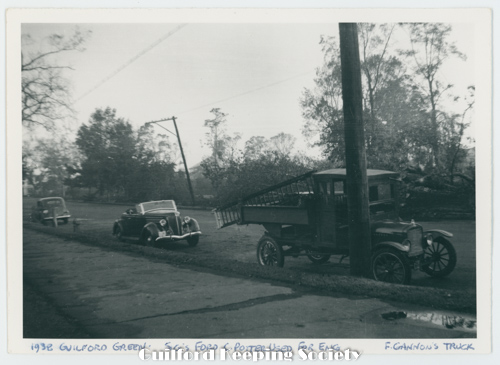 View from Whitfield St toward Broad St across the Green toward First Congregational Church at 110 Broad St Note Steeple missing from North Church. Sig's Ford Potter used for Eng. F. Gannon's truck Sept 1938