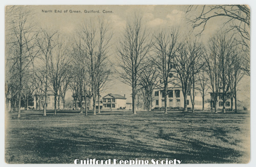 double colorized postcard pub. by CCMarkham Guilford Green view from center of the Green looking toward Whitfield St Boston St on far left donated by