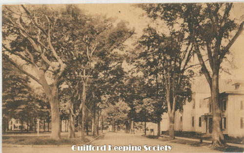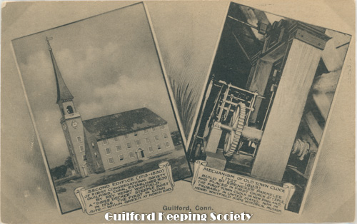 Tinted postcard pub. by Harrison Monroe, Town Hall, Guilford, Conn. Town Hall is on the left, 31 Park St Date postmark August 13, 1917
