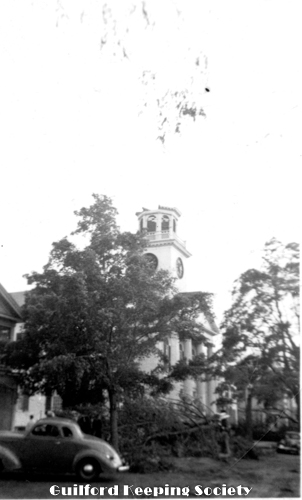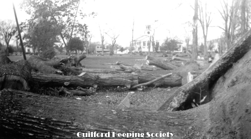 Guilford Green with fallen trees and First Congregational Church 110 Broad St in background some days after Sept 22, 1938