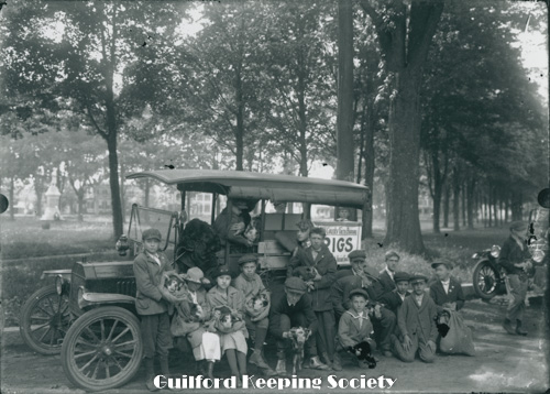 New Haven County Farm Bureau truck on east side of Green. Children all holding pigs. Date based on Shelton Dudley’s note Date c1920