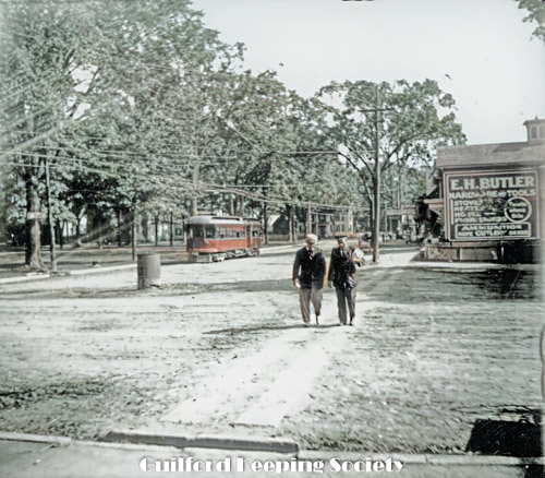 Trolley car on Boston St viewed from the Monroe building at the corner of Whitfield and Boston St Looking east on Boston St. Date c1910. E. H. Bulter hardware store at location of Page’s Hardware today (c)