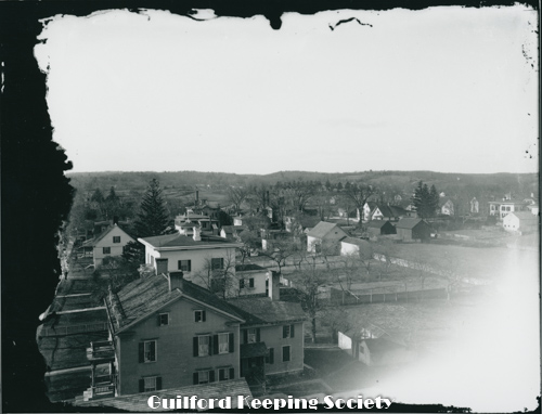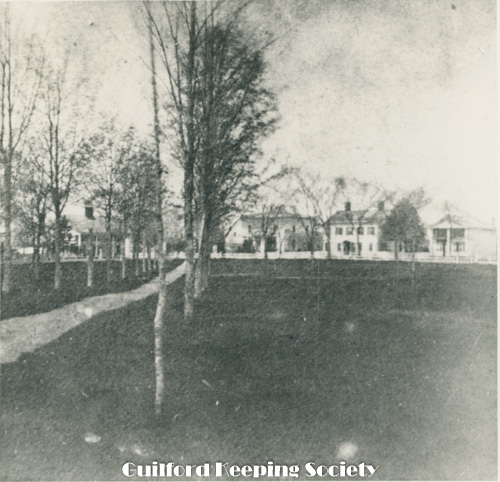 left to right Guilford Town Hall 31 Park St, Dr. John Redfield house (moved to 47 Broad St) - site of town hall parking lot, Christ Episcopal Church 17 Park St, Dr. Jared Redfield house 11 Park St Date c1865