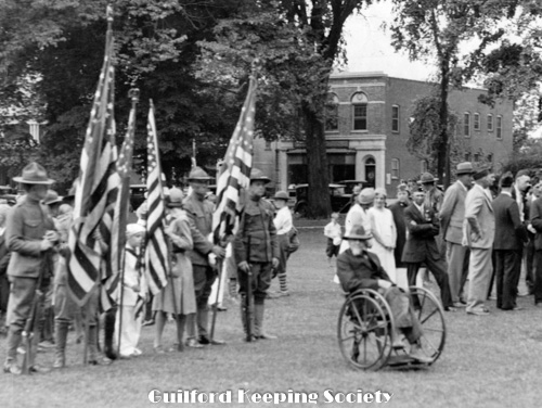 WWI veterans assembled Memorial Day, 1925, Douden Drug store 87 Whitfield St in background, Daniel Sullivan in wheelchair, Ernest Griswold flag-bearer on left, from Anna Jo Harrison July 2003