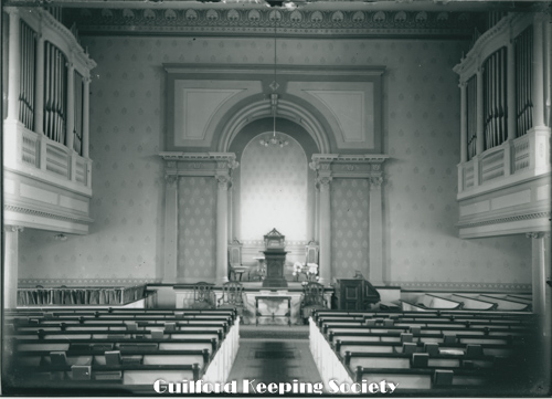 interior of First Congregational Church looking toward pulpit with organ pipes in both balconies 110 Broad St, Date c1915