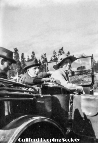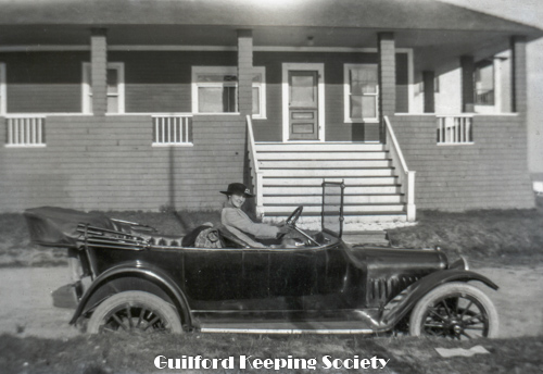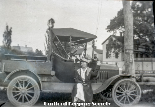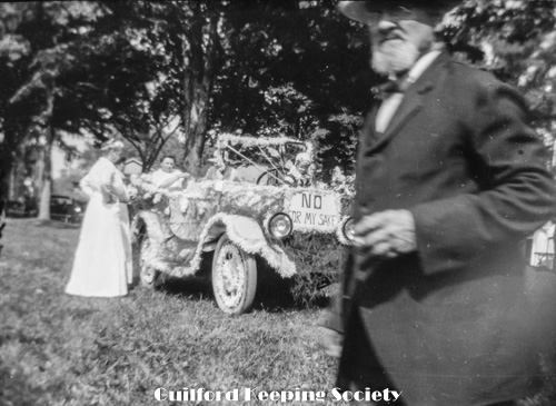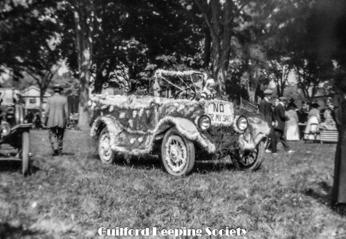 Guilford Fair Parade, 1919. Decorated automobile, banner reads “This car is trimmed with wool at $1 a pound”. SLT Sept 1919: “The limousine owned by A. D. Munger was a great novelty never before seen here. It was decorated in red and white and in a small box fastened to the hood and over the radiator was a pretty lamb plaintively bleating. On top in a wire cage were a half-dozen full grown sheep. Around the top of the machine was a banner bearing the inscription, “This car is trimmed with wool worth a dollar a pound.” This float won first prize in category “Trimmed autos..”