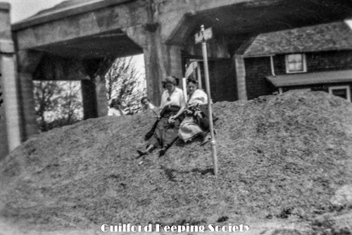 KFH and friend on sand pile at trolley viaduct at intersection of Rt 146 and Mulberry Point Rd, possibly a construction site.