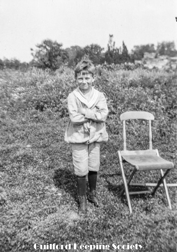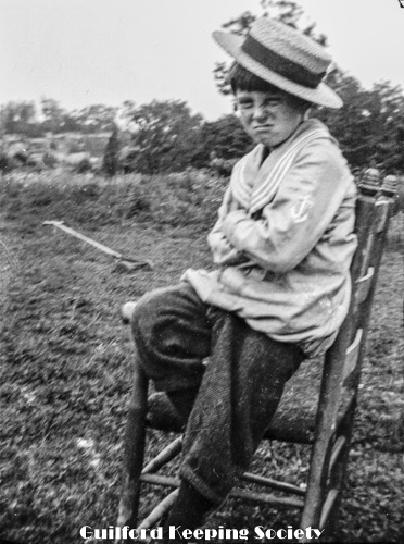 Boy sitting on arm of chair, manual push lawnmower on the ground nearby. Boy is possibly Frank, son of MJSK.