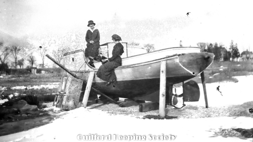 Memorial Day exercises, West River, four women in boat, one man, trolley car barn and Billie Willard House on right.