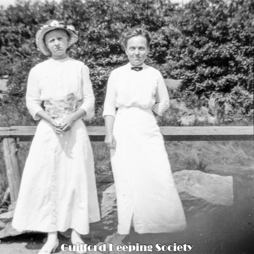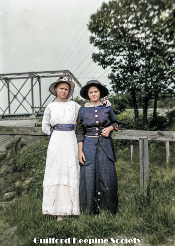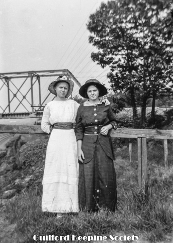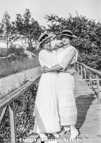 Kitty Fowler and Jessie Scranton Shippee (woman friend #10), on Mulberry Point Road bridge, trolley trestle bridge over railroad tracks in background, c1920.