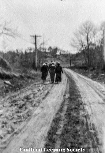 Mulberry Point Rd, KFH and friend with parasol, walk toward houses in the distance, along unpaved Mulberry Point Rd.