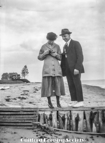 Same couple as previous (#77), standing on beach retaining wall, view of houses and trees in distance, she is holding a camera.