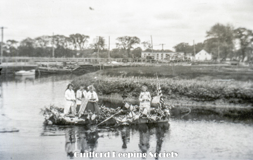 Women in boat, flag bunting, Memorial Day at Jones Bridge West River.