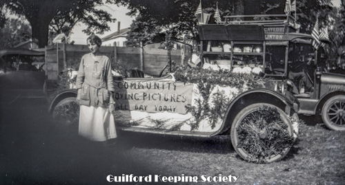 Guilford Fair Parade 1919, Decorated automobile with sign “Community Moving Pictures All Day Today”. Truck in background with words “Gaylord” and “Clinton” carrying pots, tins, pails, buckets, brooms: this is Frank Gaylord of Clinton with household wares (SLT 1919). Woman friend (#5) on left in foreground.