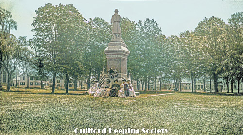 Women seated around Soldiers' Monument on Green, looking southeast c1920. Note John Redfield House south of Town Hall.