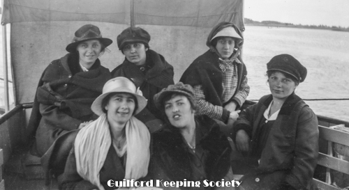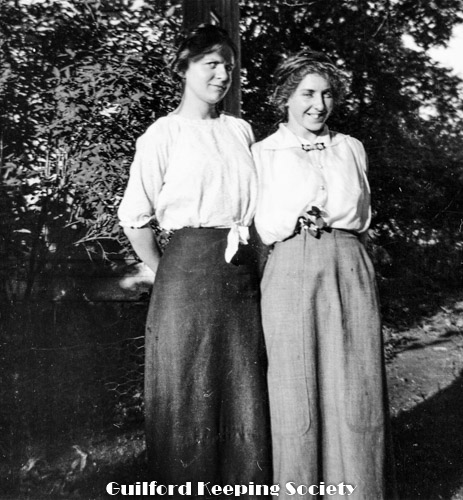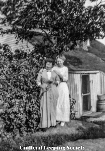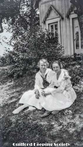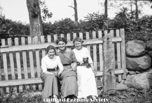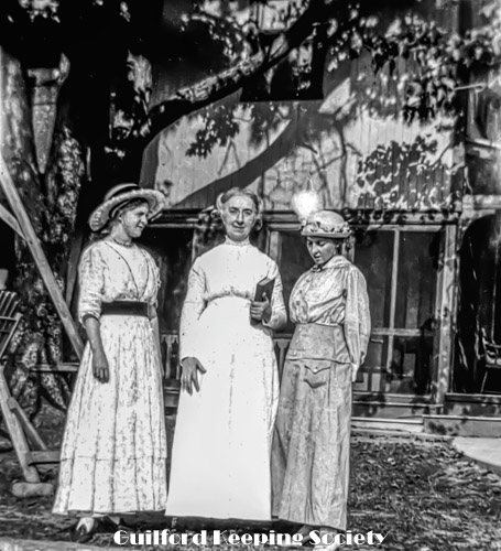 Three women standing (KFH, #15 with book in hand and #3). Part of lawn swing on left. At Rice’s Limewood Grove House, Indian Neck, Branford.
