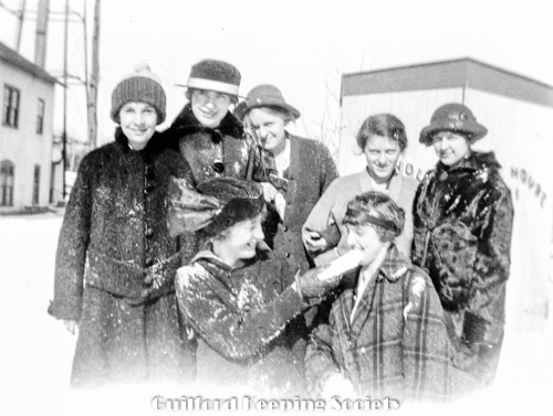 Hose House No. 2, water tower in background. Kitty and six other women, one biting into snow. Top row, left to right: possibly Eva Dadman, woman friend (#2), Kitty Fowler Harrison. All others unknown, some found in Mill Pond group photo.