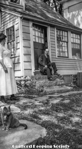 Small house on Water St, with dog on porch, near marsh or field, summer. House was demolished c1980.