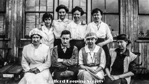 Knowles-Lombard Canning Factory, group photo. Top row, left to right: perhaps Edna Norton, Elsie Jacobs (Galvin), –, possibly Sophie S. Hall. Bottom row: Eva Dadman Roode, man and two women and right unknow. Two women are wearing hair nets.