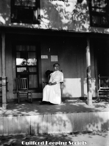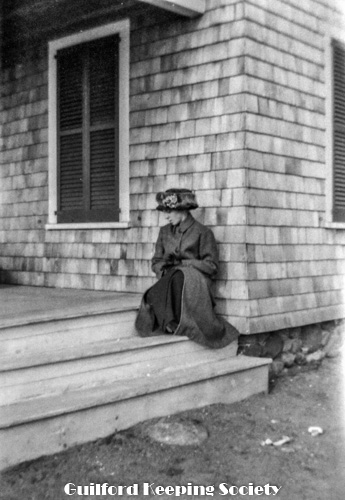 Woman (#15) sitting in chair on porch, at Rice’s Limewood Grove House in Indian Neck, Branford by the shore.