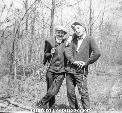 Two lads posing, with walking sticks. John Hubbard and Harold Fowler.