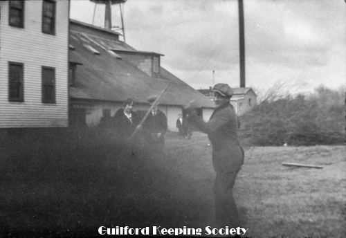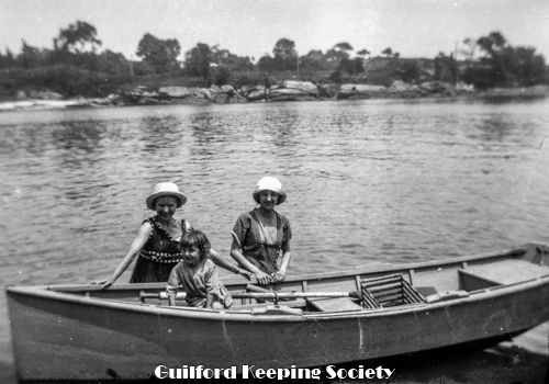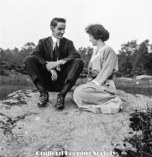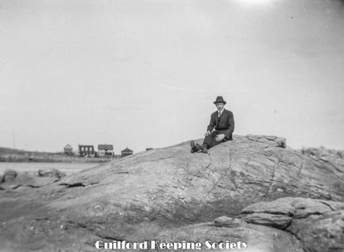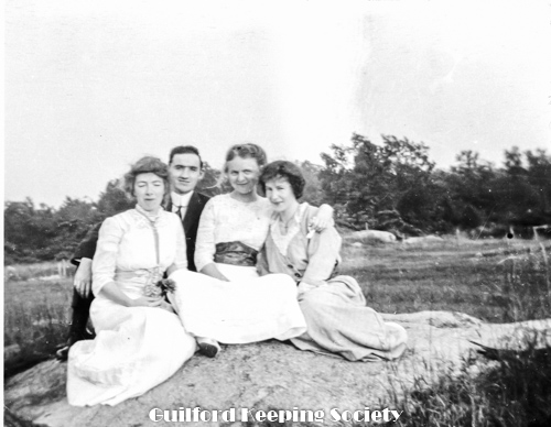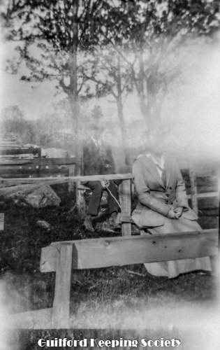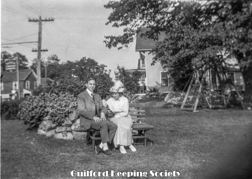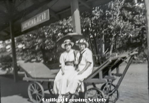 Harold Fowler on bench with woman #3, sign over street “Rice’s Limewood Grove House” a summer only hotel on Limewood Ave (Rt.146), Indian Neck, Branford, CT.