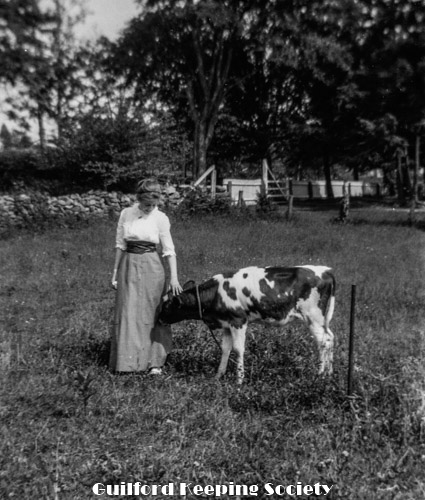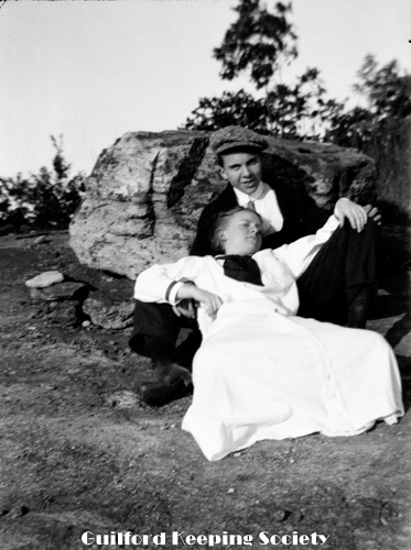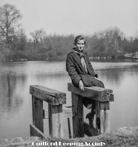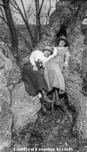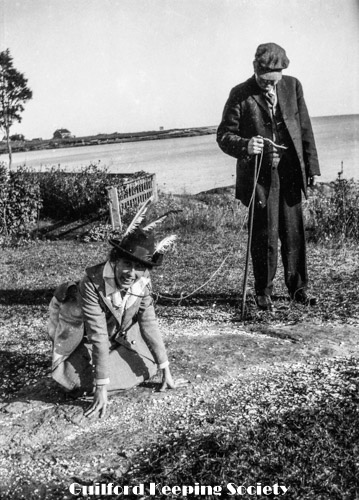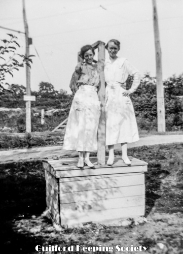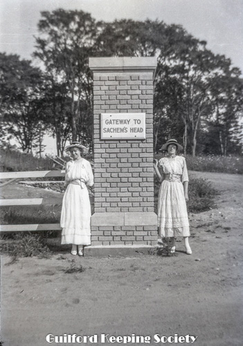 Kitty and woman friend (#1) at newly erected pillar with sign “Gateway to Sachem's Head“, possibly known previously as “Grove Hill” or “Goodyear's Grove”.