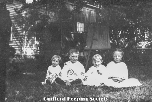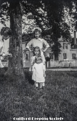 Woman on left, and three children in a row. House in background. Possibly Josie Scranton (=Minnie Josie Scranton Nann, and her 3 daughters in North Branford, CCC).
