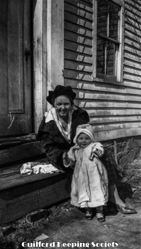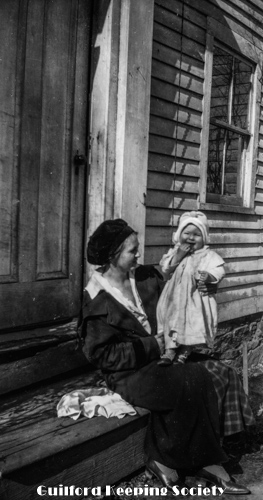 Woman friend (#10, Jessie Scranton Shippee) on steps of house with baby.