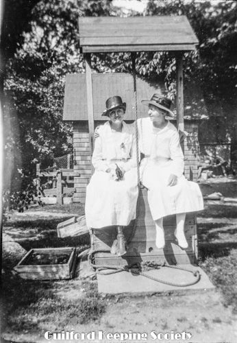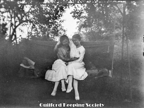 Kitty and friend on lawn swing (at the Harrison house).