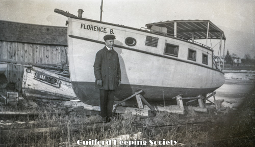 Man with cigar, in front of boat named “Florence B.” in winter storage on blocks, possibly Sachem's Head.