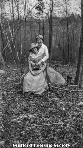 Kitty and woman friend (#1) sitting on a rock in the woods, holding a box camera.