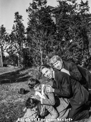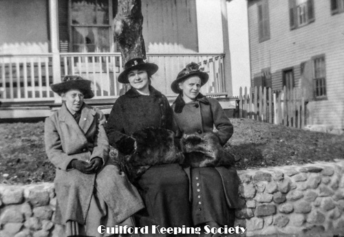 Three sitting on stone wall. Left to right: friend (#21), friend (#2), and Kitty Harrison.
