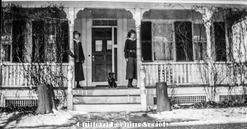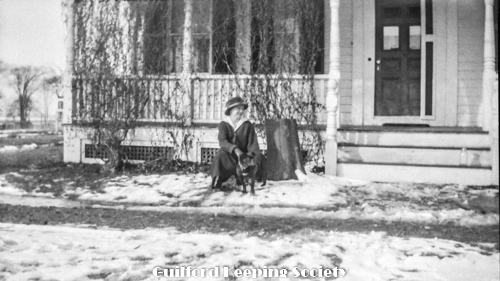 Kitty and Woman (friend #1) friend on porch of house at 201 Water St, with dog, one milk bottle on steps, winter.