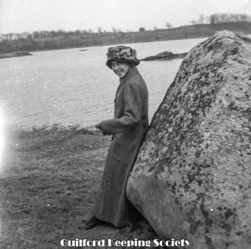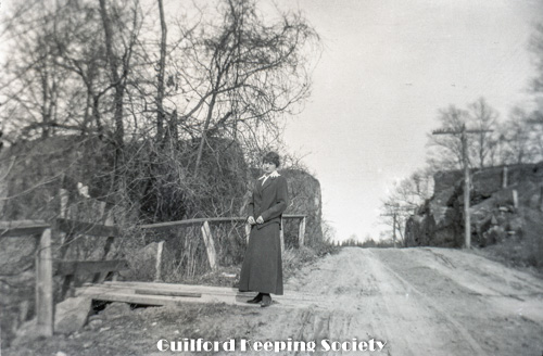 Woman (friend #1 or #16) standing on Rt. 146 Leete's Island Rd looking westward, near cut in rock ledge, boards to side road.