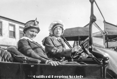 Kitty and woman friend (#1) in 1914 Cole 4-Door Touring Car with W.S.H initials on door, indicating an unknown owner of car. Kitty wearing her wedding ring.