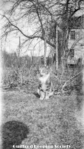 Kitty wearing glasses, outside house on Water St, same day and location as photo #56.