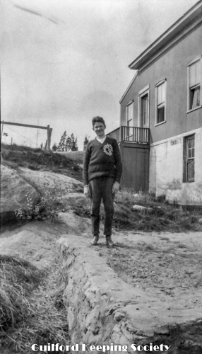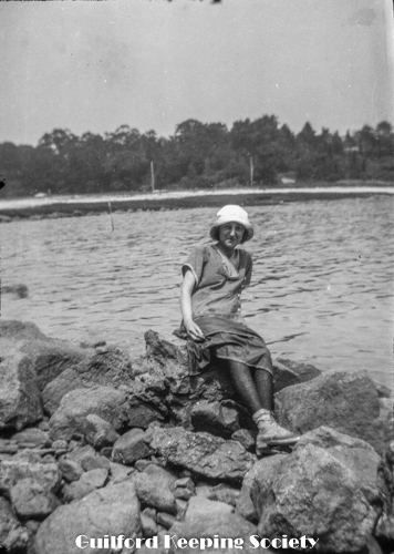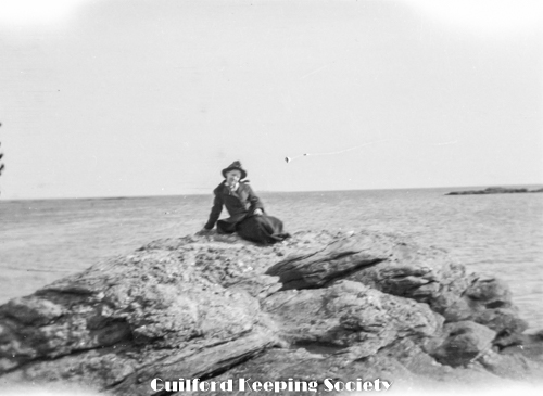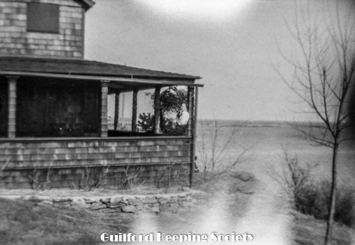 Beach cottage overlooking water, with a woman on the porch of a shingled shore cottage, water in background. Possibly Louis Anderson’s cottage at 815 Mulberry Point Rd (photo blurry).