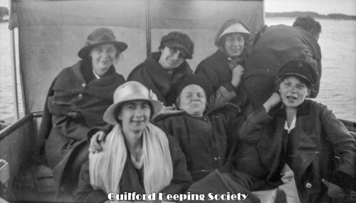 Group photo of a crowd on a boat ride. Location unknown. Top left: possibly Eva Dadman, unknow man (possibly in #301), woman friend (#2). Middle left: Kitty, and three women friends.
